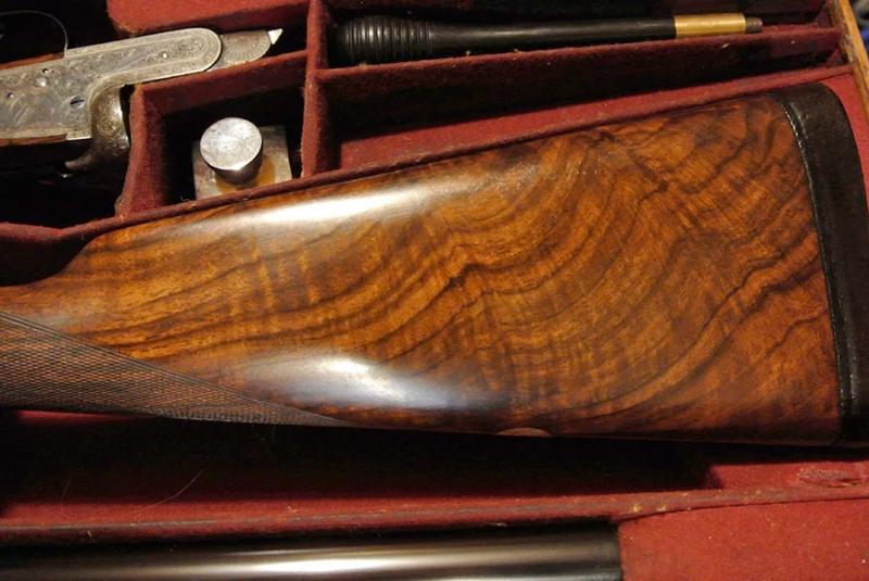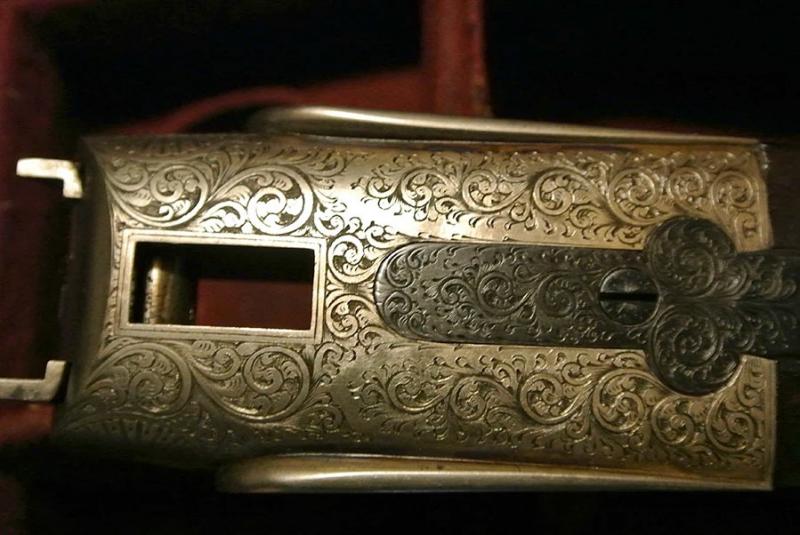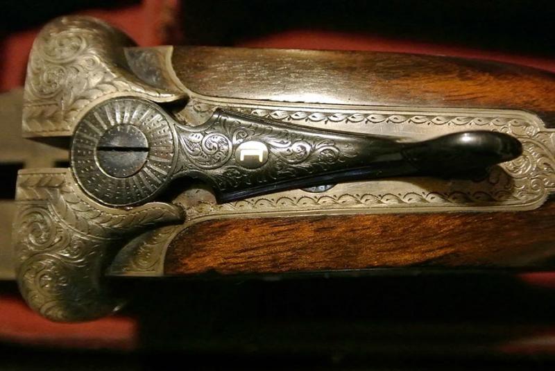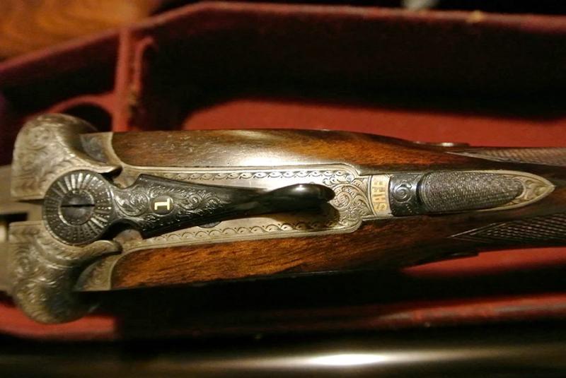 A fine pair of CHARLES HELLIS & SONS 12-bore "Featherweight" Sidelock Ejector guns with 26" nitro proof barrels, 2 1/2" chambers bored approximately 1/4 and full choke. Top extension, the frames, locks and gold-numbered top levers with fine border and scroll engraving surrounding a pair of feathers within a shield, retaining much original hardening colour. The maker's name signed within a scrolling banner. Lined cocking indicators, rolled edge trigger guards. 14 1/4" well-figured stocks. In their brassbound oak and leather case.