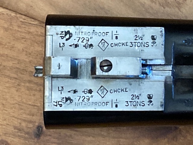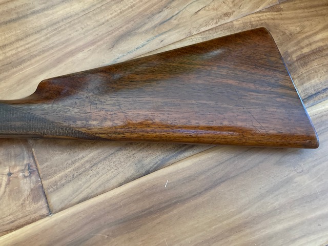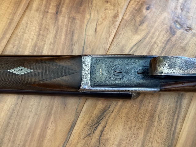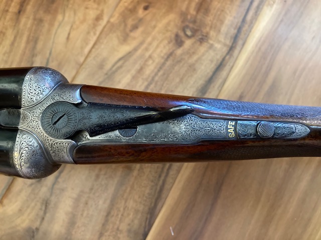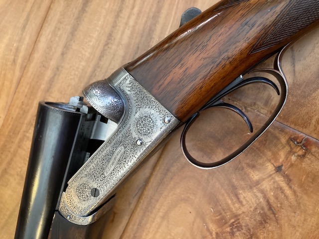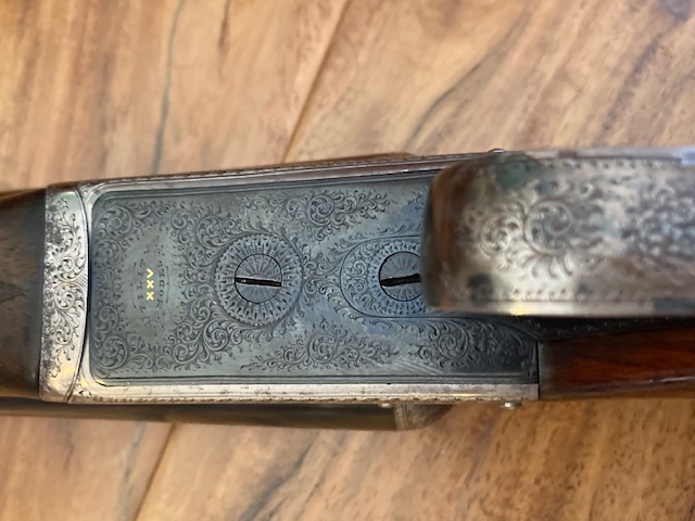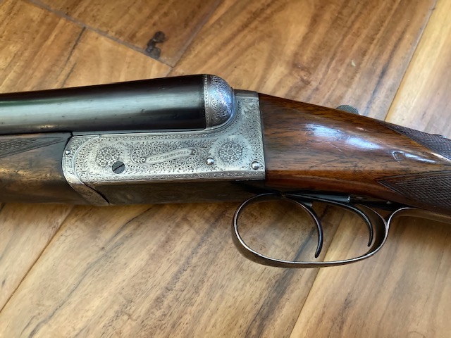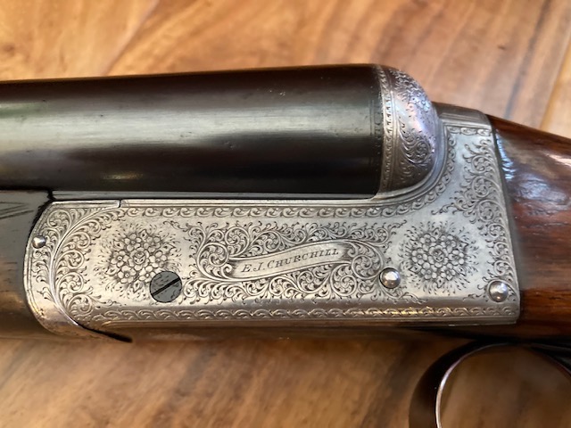 A 12-bore 'Utility XXV' model boxlock ejector with 25" nitro reproved barrels with matt Churchill rib, gold inlaid 'XXV' at the breech end, tubes engraved 'E.J. CHURCHILL (GUNMAKERS) LTD. 39 TO 42 LEICESTER SQUARE. LONDON.' Gun has 2 1/2" chambers, bored approximately improved cyl. and 1/4 choke, treble-grip action with hidden third bite, automatic safety with gold-inlaid 'SAFE' detail and bouquet and scroll engraving. Underside has the model designation and retains slight traces of original colour-hardening and a much renewed finish. Gun is in its lightweight case.