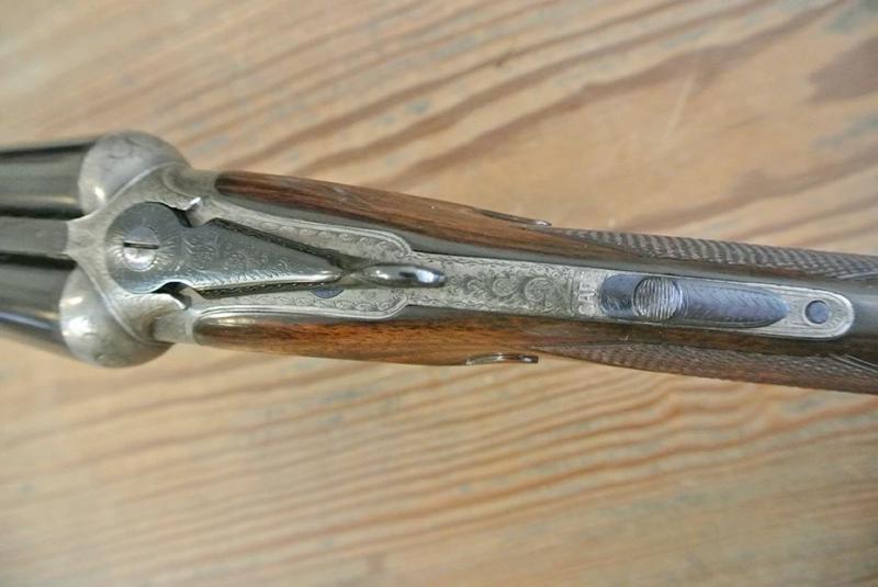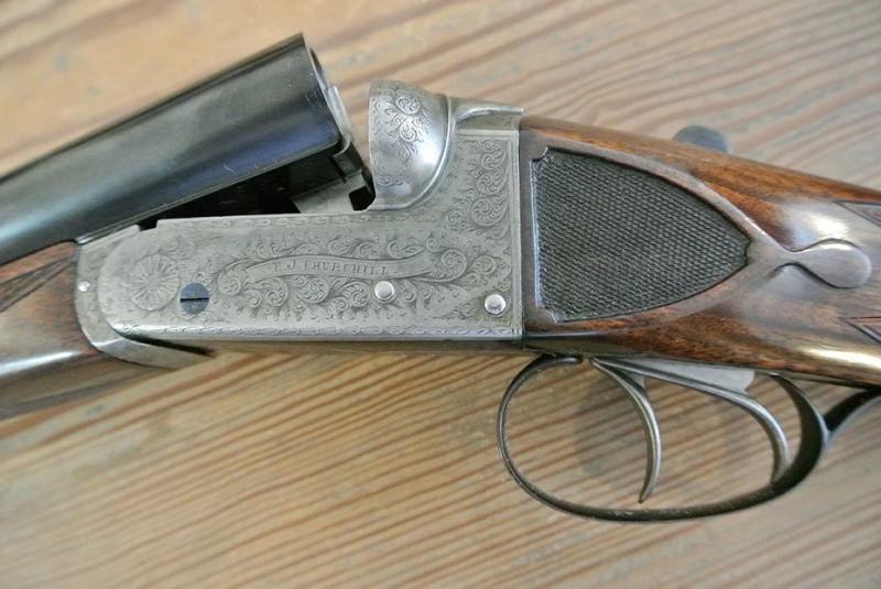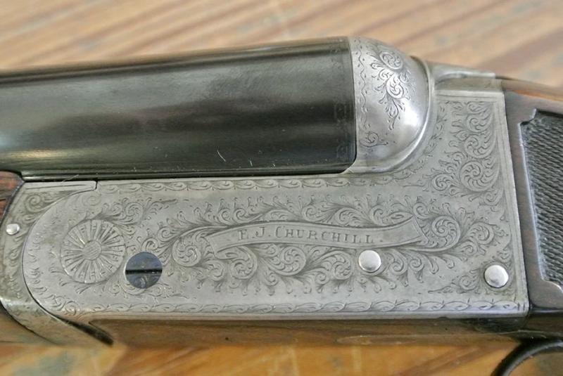 A 20-bore boxlock ejector with 26" nitro barrels, the tubes engraved 'E.J. CHURCHILL (GUN MAKERS) LTD. ORANGE ST. GUNWORKS. LEICESTER SQUARE. LONDON.' and the rib with a flash of scroll engraving at the breech-end. 2 1/2" chambers bored approximately true cylinder and 3/4 choke. Automatic safety with silver-inlaid 'SAFE' detail, border and acanthus scroll engraving surrounding a banner inscribed with the makers name and retaining traces of original colour hardening and finish. 14 3/4" figured stock with chequered recessed side panels.