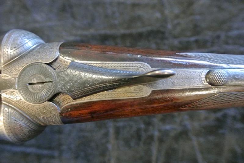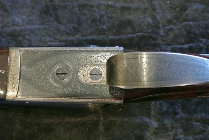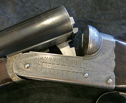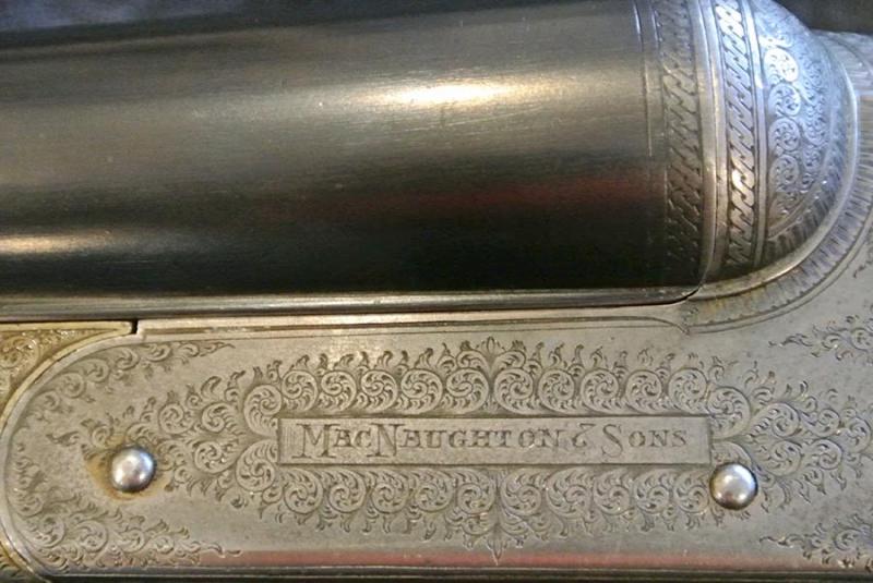 A 12-bore boxlock ejector with 28" nitro reproved barrels, the rib engraved 'JAMES MACNAUGHTON & SONS. 36 HANOVER STREET EDINBURGH.' Scroll-backed treble-grip action, automatic safety, fine border and scroll engraving, retaining traces of original colour-hardening. 2 3/4" chambers bored approximately improved cylinder and full choke. 14 1/4" stock.