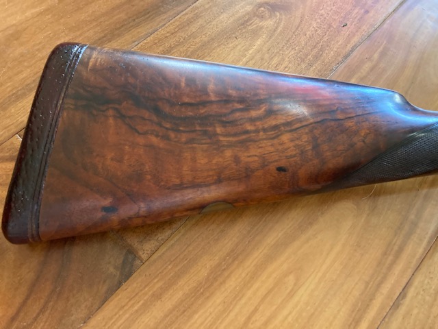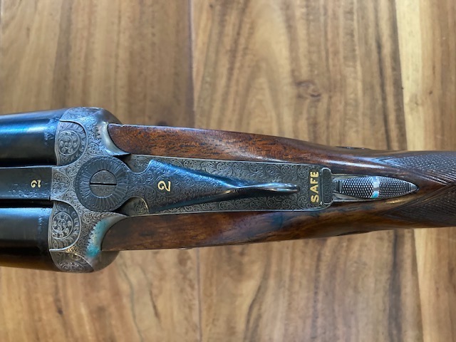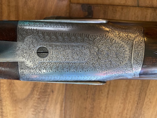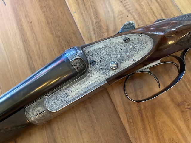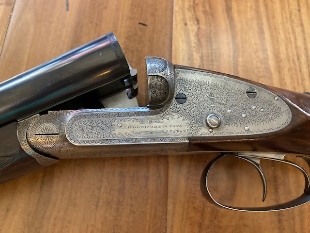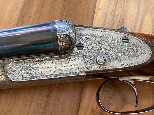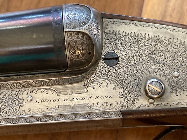 A 12-bore sidelock ejector with 28" sleeved nitro barrels, retaining original rib engraved 'JAMES WOODWARD & SONS. 64 ST. JAMES'S STREET. LONDON. S.W.', and gold-inlaid '2' at the breech end, 2 1/2" chambers, bored approx. 1/4 and 3/4 choke. Carved arcaded fences, toplever gold-inlaid '2', automatic safety witlh gold-inlaid 'SAFE' detail, protruding tumbler pivots with gold-inlaid cocking-indicators, fine acanthus scroll engraving, brushed finish. 13 3/4" highly-figured replacement stock including basketweave buttplate.