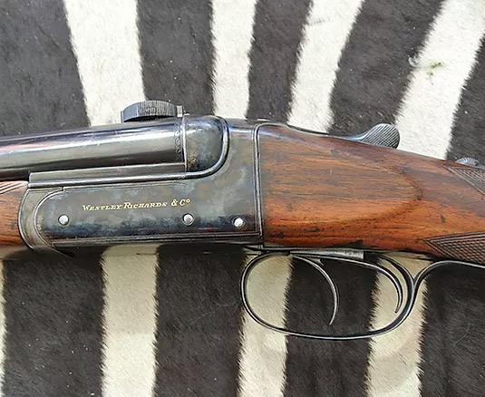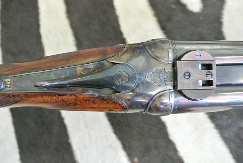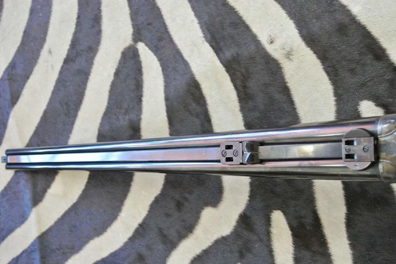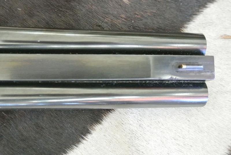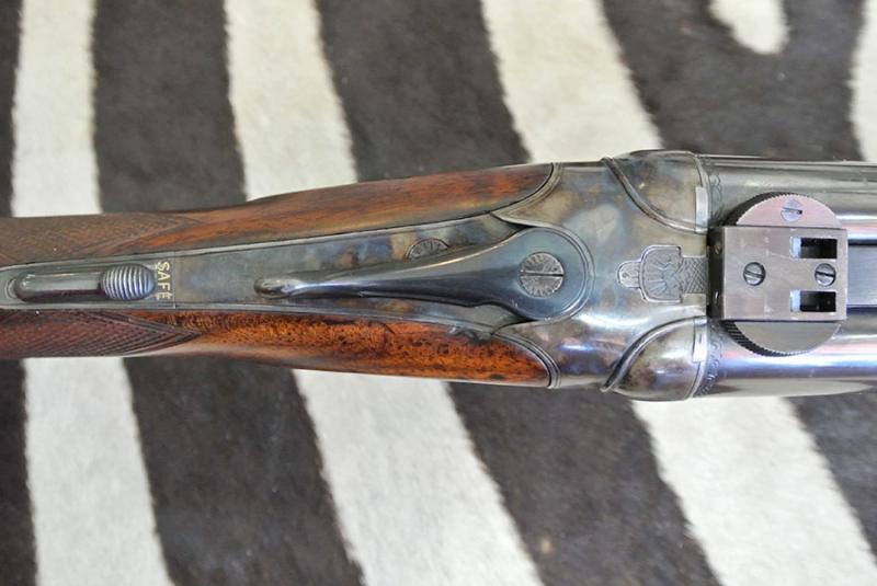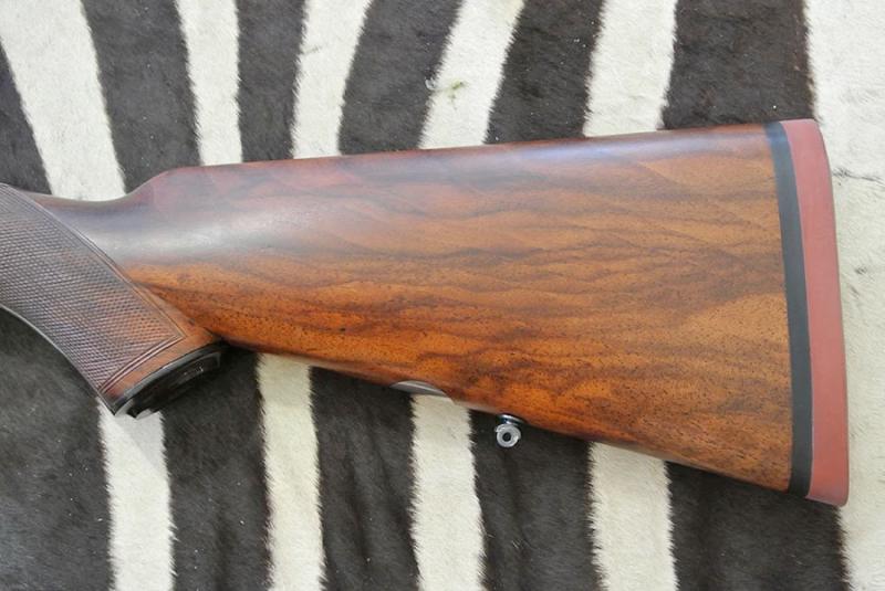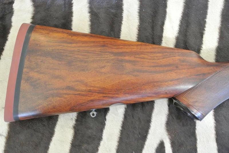 This 9.3 x 74R (equivalent to a .375) boxlock non-ejector rifle has 26" nitro proof barrels with raised fore sight, rear sight and folding leaf to 100 yards, Doll's head extension and mounted with a Zeiss Varipoint 1.1-4 x 24 telescopic sight, with quick detachable claw mounts. The re-coloured frame with border engraving, the maker's name signed in gold. 14 1/4" well-figured stock with pistol grip and recoil pad, sling eyes. This gun has been refurbished by the maker.