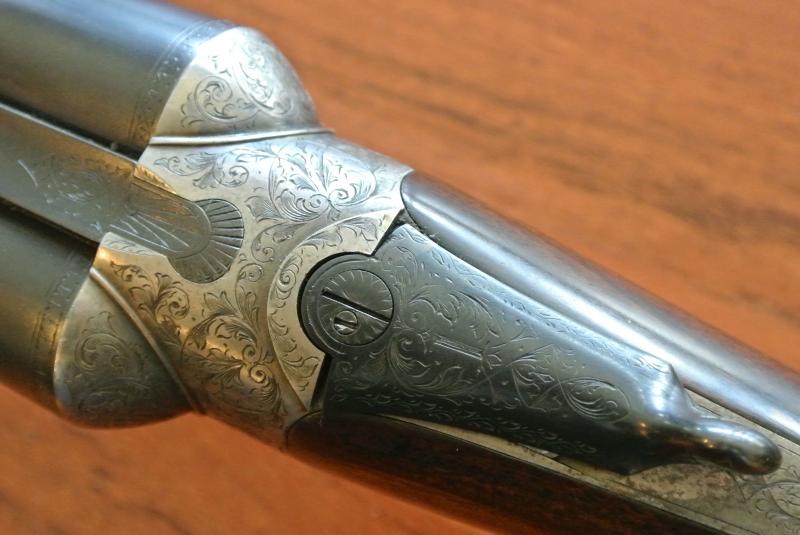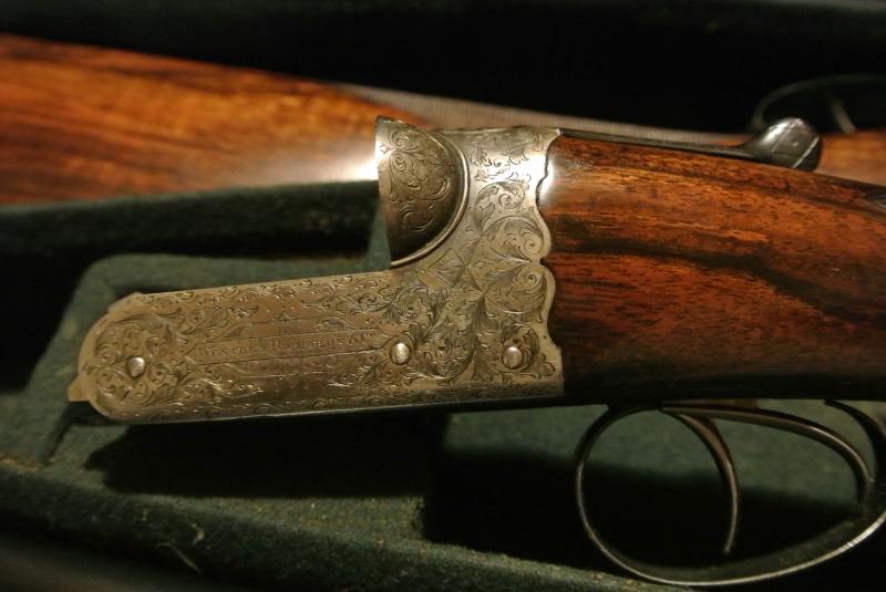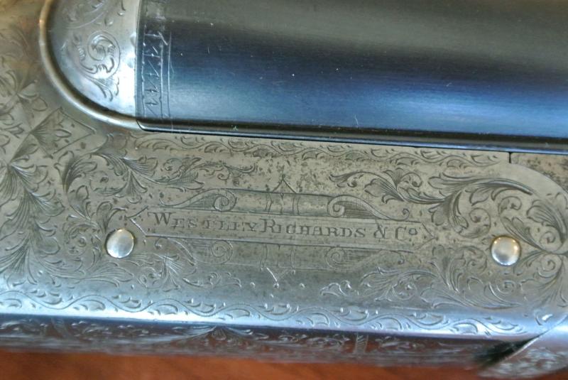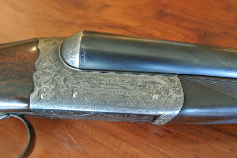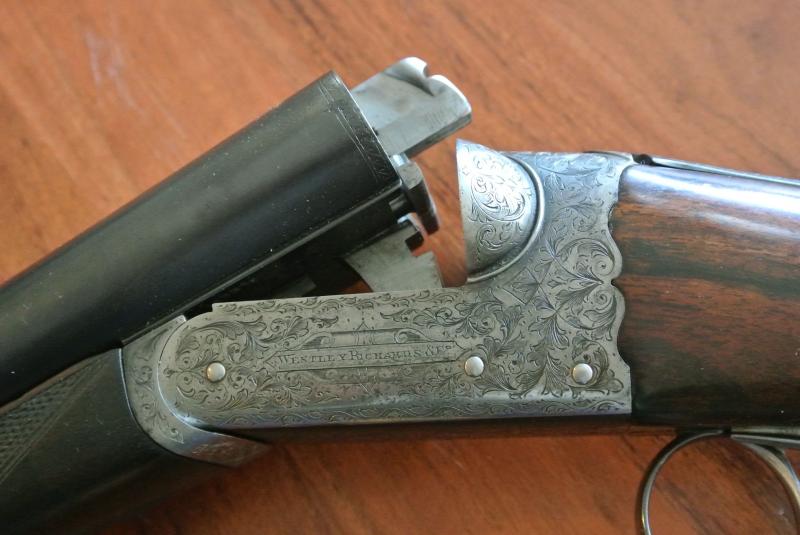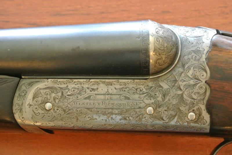 A composed pair of 12-bore boxlock ejector guns with 28" nitro reproved barrels, the ribs engraved 'WESTLEY RICHARDS & CO. LONDON' and inscribed '1' and '2' at the breech ends. The guns have 2 3/4" chambers bored approx. 1/4 and 1/2 choke in both, scroll-back treble-grip actions and Westley Richards patent toplevers engraved with a six-point star. It has automatic safeties, hinged floorplates, engraved with foliate scroll surrounding banners engraved with the makers name and retaining very slight traces or original colour-hardening and finish. The stocks are 14 3/4" and the pair is in a leather double case.
