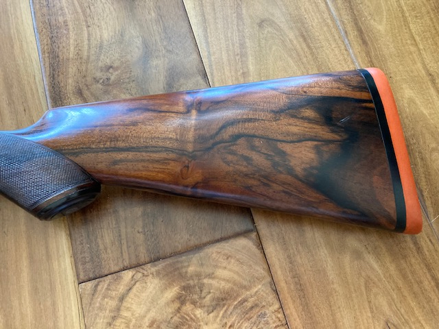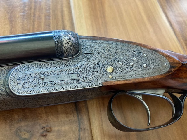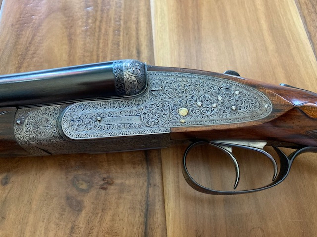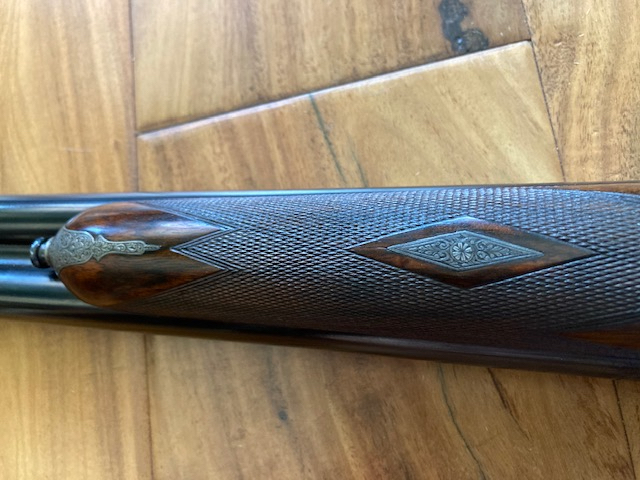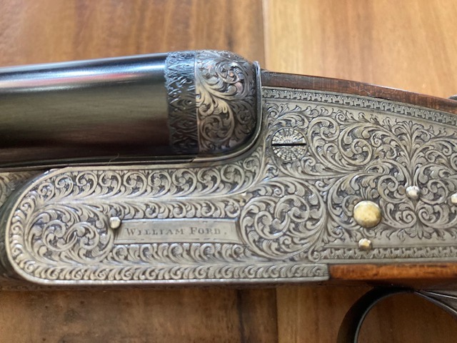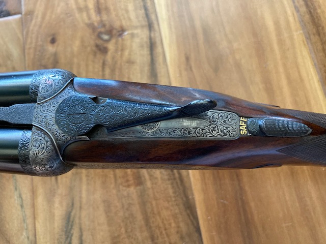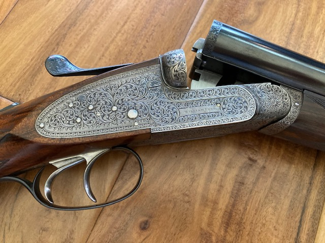 A fine 20-gauge sidelock ejector gun with 25" nitro proof barrels and 2 3/4" chambers, bored about 1/4 and 3/4 choke, matted Churchill rib, the frame, locks and top lever with fine foliate scroll engraving and retaining much original hardening colour. Has a 14 1/2" pistol grip stock and rubber recoil pad. In its maker's lightweight leather case.