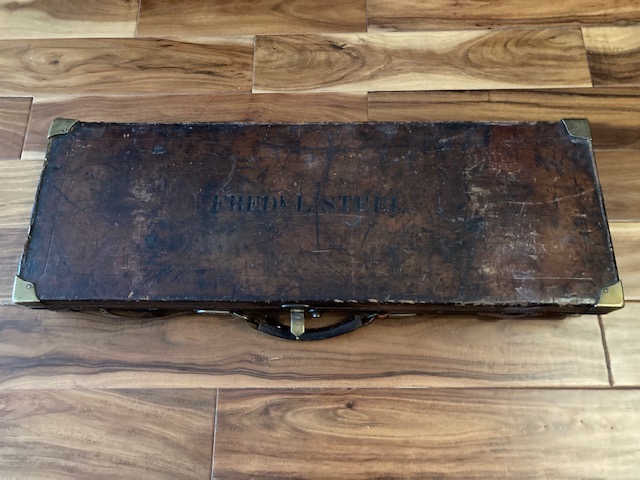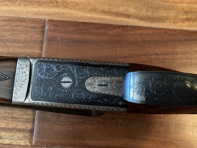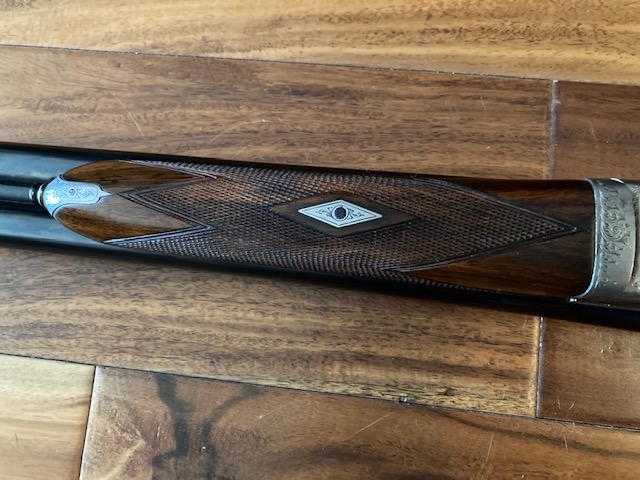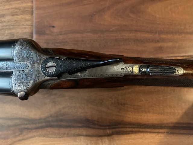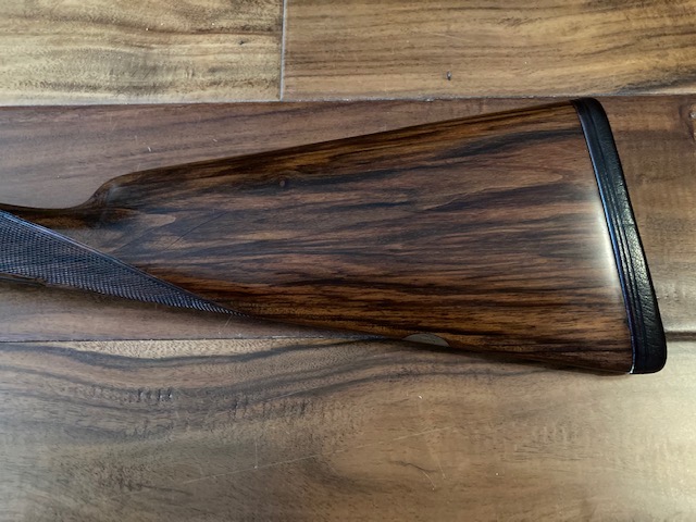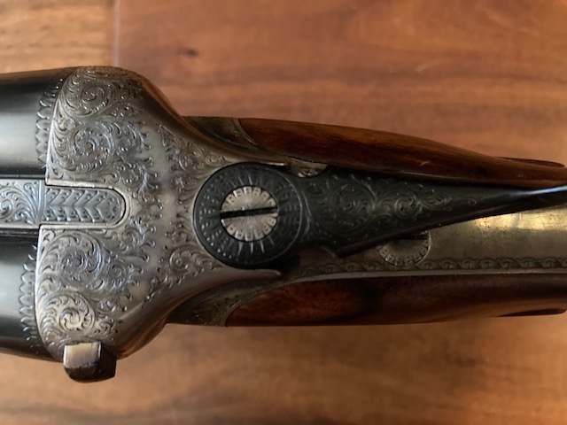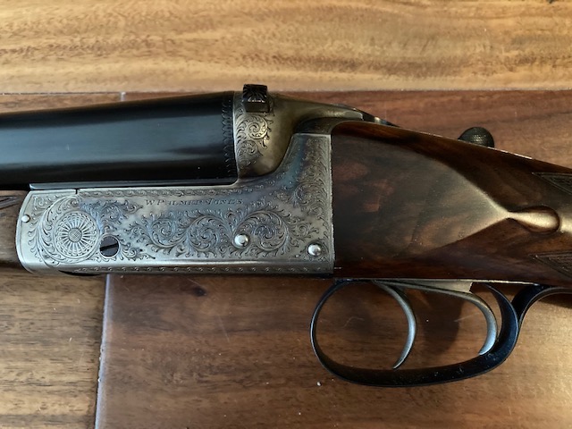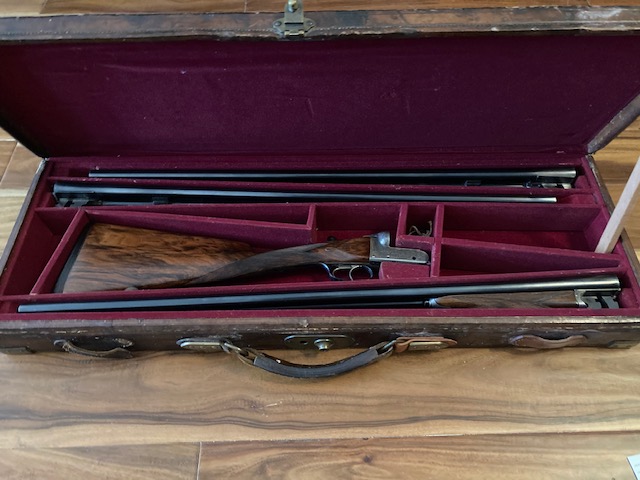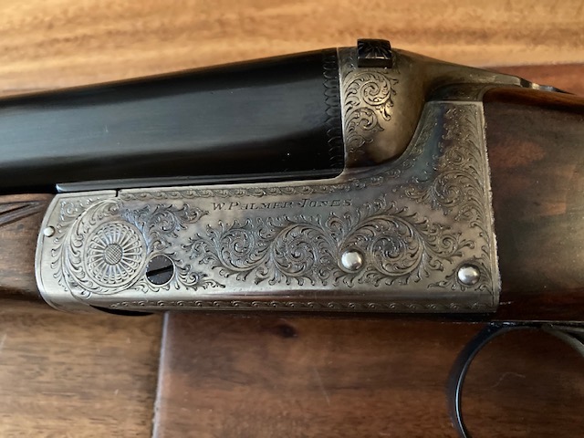 This 20-bore boxlock ejector gun has three sets of barrels. One original 29 1/4" nitro barrels, rib engraved 'W. PALMER JONES. MAKER. BIRMINGHAM.' with 2 3/4" chambers, bored approximately 1/4 and 1/2 choke. A second original are 28" nitro barrels with 2 1/2" chambers, bored approx true cyl and 1/4 choke. The third set of barrels are 28" nitro (proof date 1953), with rib engraved 'W. PALMER JOENS. MAKER. BIRMINGHAM.' with 2 3/4" chambers, bored approx. 1/4 and 1/2 choke. Gun has treble-grip action with square section crossbolt, automatic safety with gold-inlaid 'SAFE' detail, bold acanthus scroll engraving, retaining some colour-hardening. Stock is 14 5/8" including buttplate. Weight is 5 lb 12 oz with 29 1/2" barrels, 5 lb 10 oz with 28" barrels and 5 lb 13 oz with 1953 barrels. Included is a brass-cornered leather case with provision for all sets of barrels.